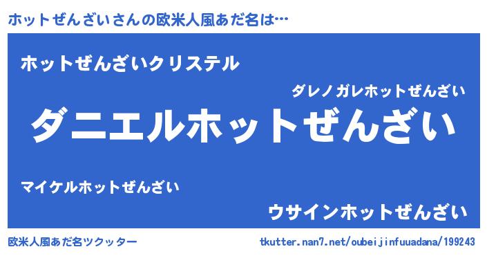 | 男性向けラノベタイトル風あだ名 | 『おまえをオタクにしてやるから、俺をホットぜんざいにしてくれ! 』 |