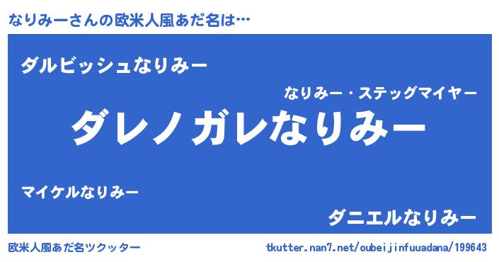 男性向けラノベタイトル風あだ名 | 『魔弾の王となりみー』『なりみーの憂鬱』 |