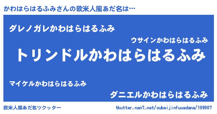 | 男性向けラノベタイトル風あだ名 | 『転生したらかわはらはるふみだった件』 |