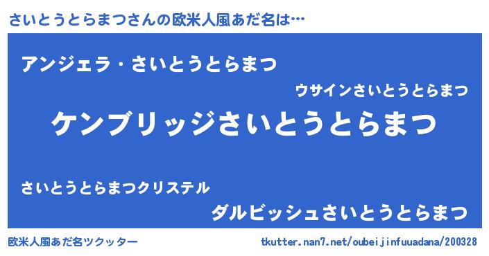 | ヘコむあだ名 | 『さいとうとらまつ(小並感)』『さいっ子』 |
