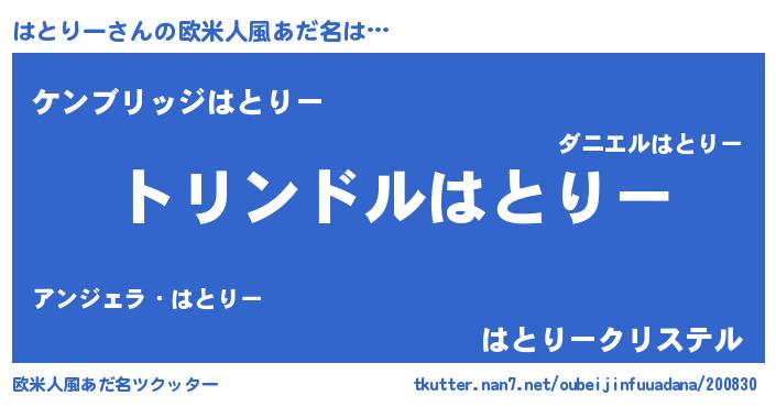| 男性向けラノベタイトル風あだ名 | 『転生したらはとりーだった件』 |