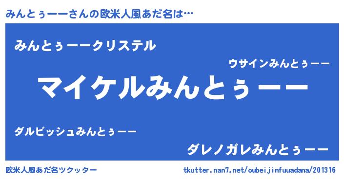| 男性向けラノベタイトル風あだ名 | 『みんとぅーーの憂鬱』 |