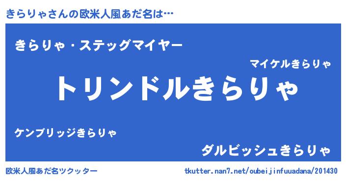 | 男性向けラノベタイトル風あだ名 | 『きらりゃ~年齢イコール彼女いない歴の魔法使い~』 |