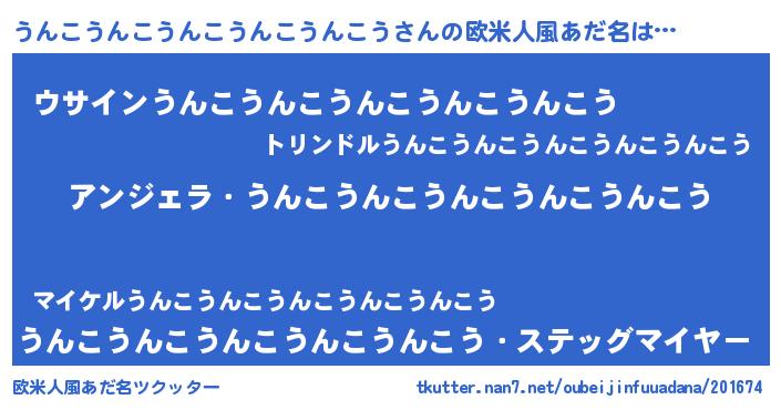 | 男性向けラノベタイトル風あだ名 | 『うんこうんこうんこうんこうんこうに滅ぼされるだけの簡単なお仕事です』 |