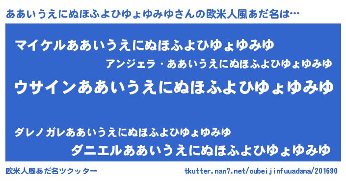 | 男性向けラノベタイトル風あだ名 | 『ダンジョンにああいうえにぬほふよひゆょゆみゆを求めるのは間違っているだろうか』 |