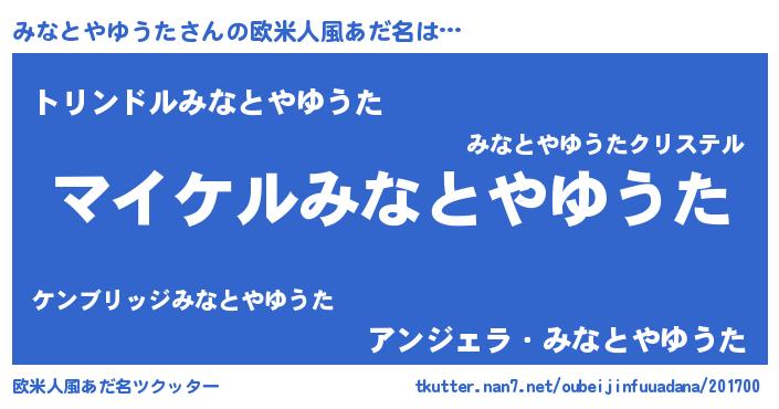 | 男性向けラノベタイトル風あだ名 | 『みなとやゆうたの憂鬱』 |