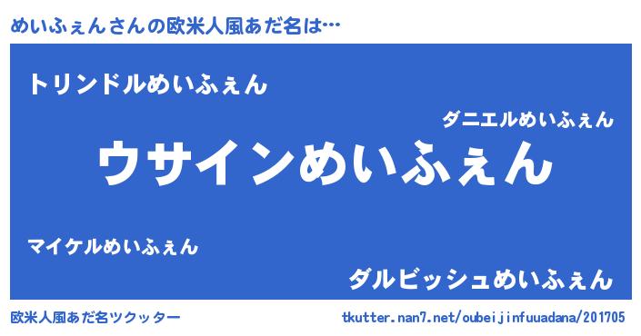 | 男性向けラノベタイトル風あだ名 | 『めいふぇんの嫁は女の子じゃないと思った?』 |