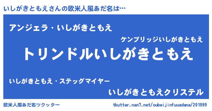 | 男性向けラノベタイトル風あだ名 | 『いしがきともえ~年齢イコール彼女いない歴の魔法使い~』 |