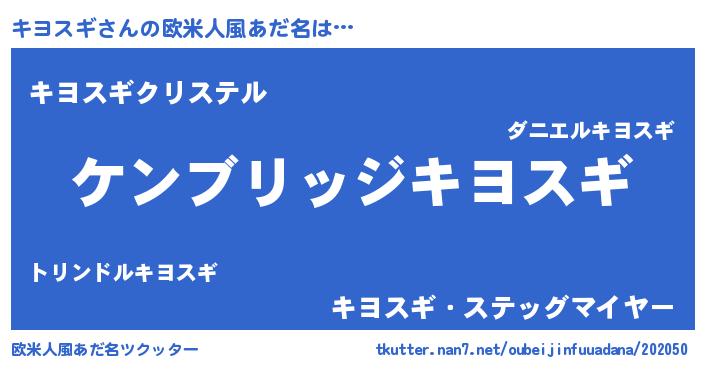 | 男性向けラノベタイトル風あだ名 | 『Re:キヨスギから始める異世界生活』 |