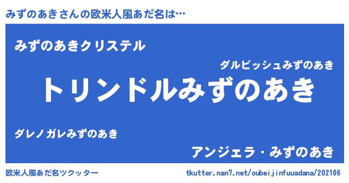 | 女子向けラノベタイトル風あだ名 | 『みずのあきの玉の輿計画!』 |