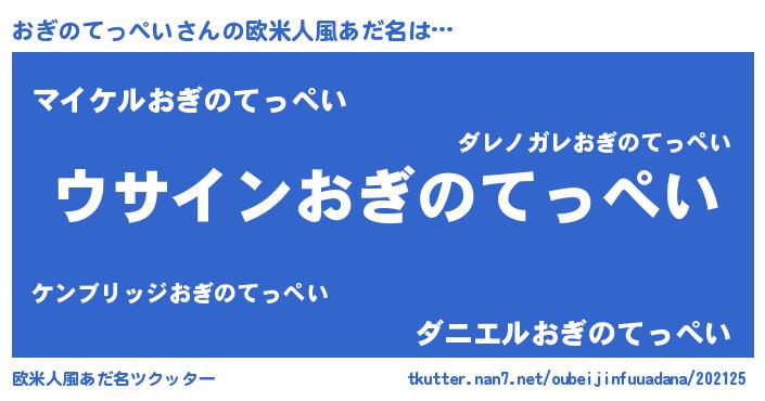 | 女子向けラノベタイトル風あだ名 | 『おぎのてっぺいの卵を拾いまして』 |