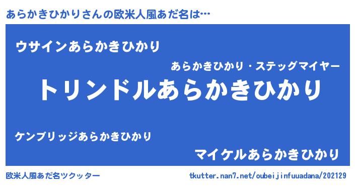 | 男性向けラノベタイトル風あだ名 | 『あらかきひかり~年齢イコール彼女いない歴の魔法使い~』 |