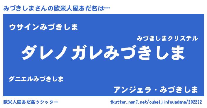 | 意味不明あだ名 | 『住所不定無職みづきしま(98歳)』 |