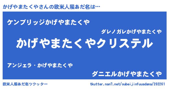 | 男性向けラノベタイトル風あだ名 | 『やはりかげやまたくやの青春ラブコメはまちがっている 』 |