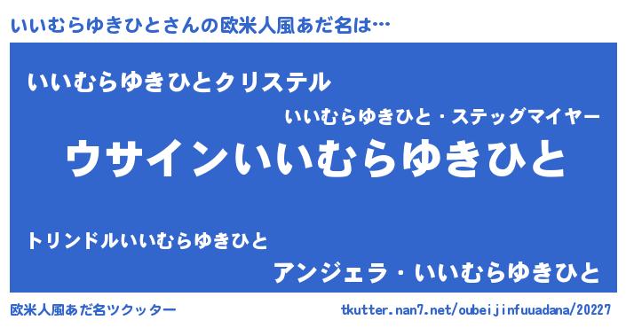 | 男性向けラノベタイトル風あだ名 | 『いいむらゆきひとの嫁は女の子じゃないと思った?』 |