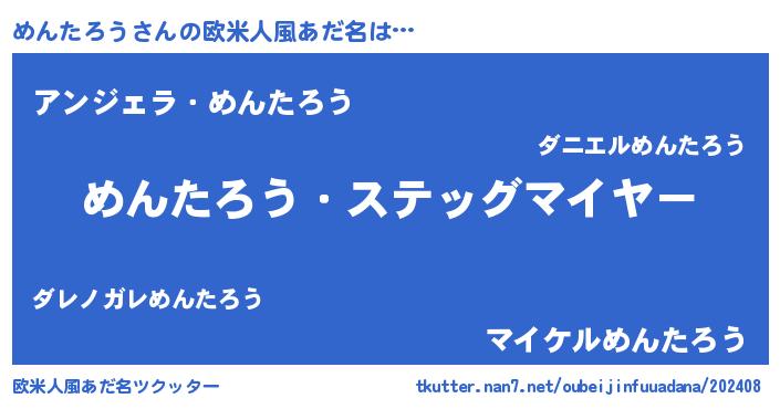 | 男性向けラノベタイトル風あだ名 | 『うちのめんたろうが世界を掌握している!』 |