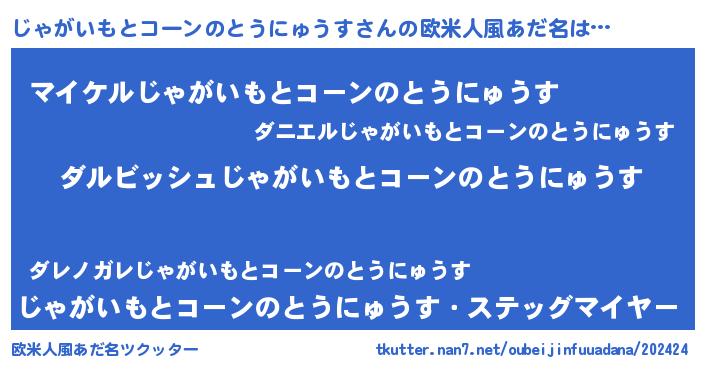| 男性向けラノベタイトル風あだ名 | 『じゃがいもとコーンのとうにゅうすという概念が存在しない退屈な世界 』 |