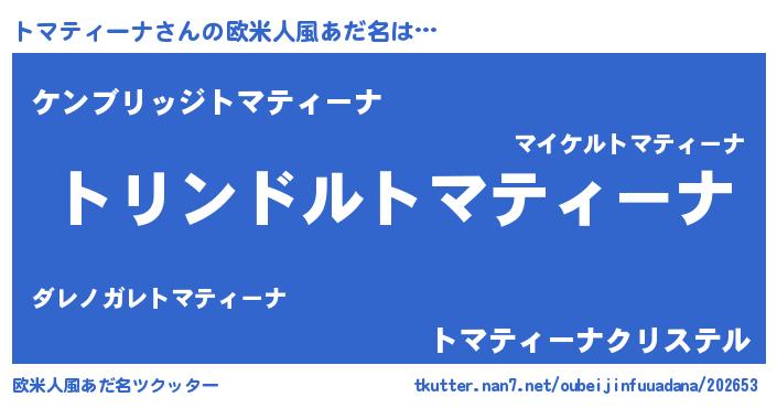 | 男性向けラノベタイトル風あだ名 | 『トマティーナ~年齢イコール彼女いない歴の魔法使い~』 |
