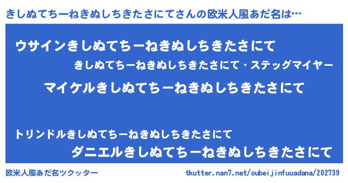 | 男性向けラノベタイトル風あだ名 | 『キシヌテチーネキヌシチキタサニテアートオンライン』 |