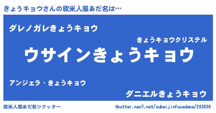| 男性向けラノベタイトル風あだ名 | 『きょうキョウの嫁は女の子じゃないと思った?』 |