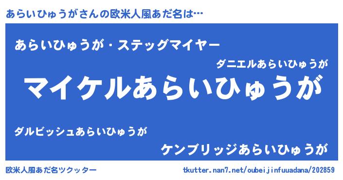 | 男性向けラノベタイトル風あだ名 | 『あらいひゅうがの憂鬱』 |