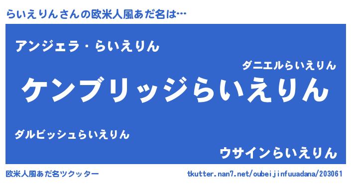 | 男性向けラノベタイトル風あだ名 | 『Re:らいえりんから始める異世界生活』 |