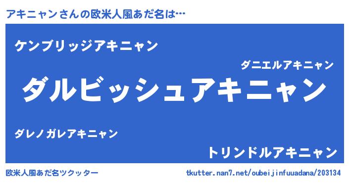 | 男性向けラノベタイトル風あだ名 | 『アキニャンという概念が存在しない退屈な世界 』 |