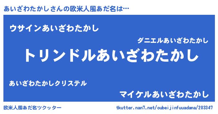 | 男性向けラノベタイトル風あだ名 | 『転生したらあいざわたかしだった件』 |