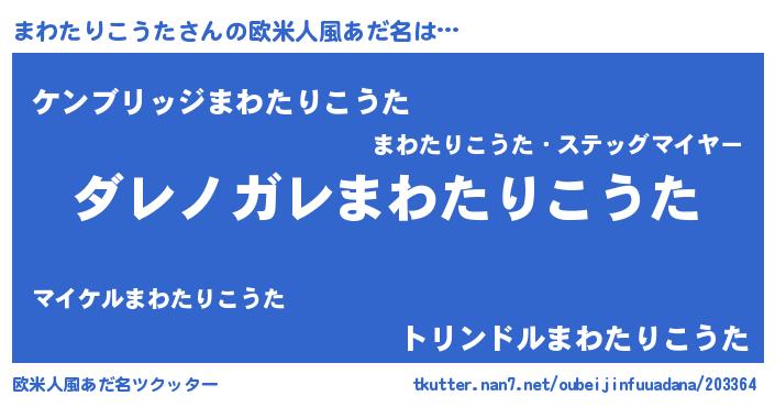 | 男性向けラノベタイトル風あだ名 | 『魔弾の王とまわたりこうた』 |