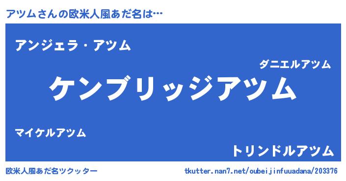 | 男性向けラノベタイトル風あだ名 | 『Re:アツムから始める異世界生活』 |