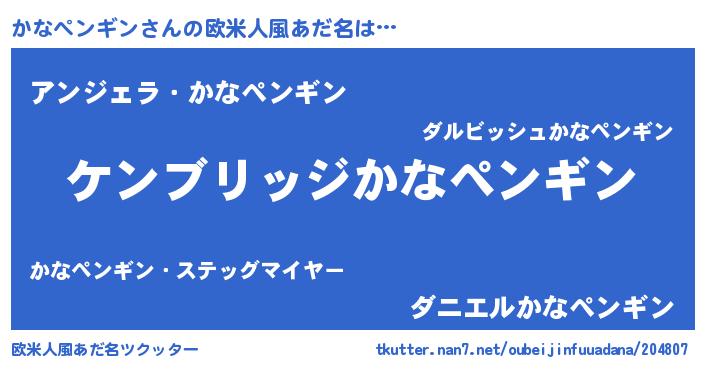 | 男性向けラノベタイトル風あだ名 | 『Re:かなペンギンから始める異世界生活』 |