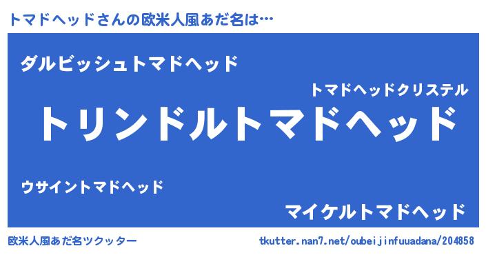 | 女子向けラノベタイトル風あだ名 | 『トマドヘッドの玉の輿計画!』 |