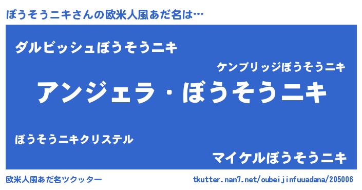 | 男性向けラノベタイトル風あだ名 | 『ぼうそうニキに滅ぼされるだけの簡単なお仕事です』 |