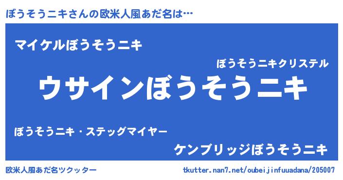 | 女子向けラノベタイトル風あだ名 | 『ぼうそうニキは平凡を望む』 |