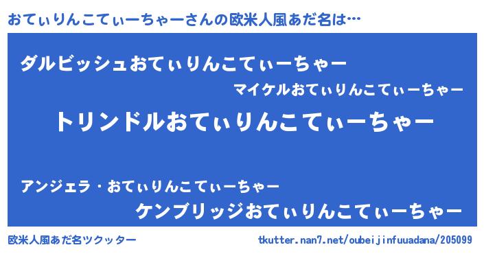 | 女子向けラノベタイトル風あだ名 | 『おてぃりんこてぃーちゃーの玉の輿計画!』 |