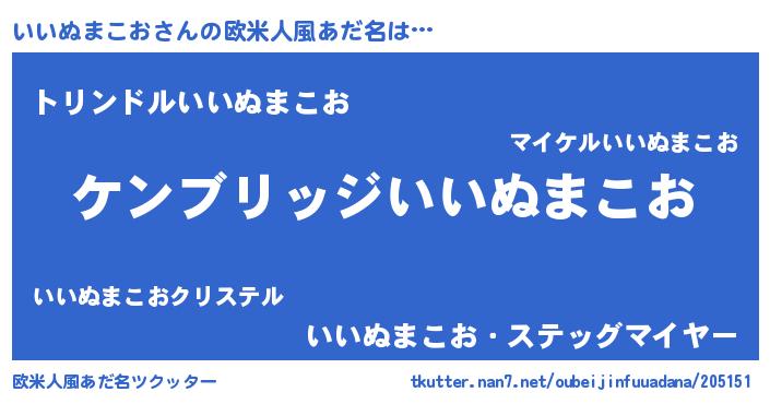 | 男性向けラノベタイトル風あだ名 | 『Re:いいぬまこおから始める異世界生活』 |