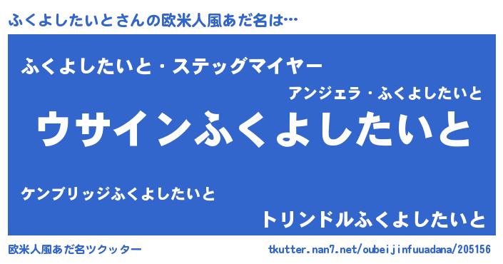 | 男性向けラノベタイトル風あだ名 | 『ふくよしたいとの嫁は女の子じゃないと思った?』 |