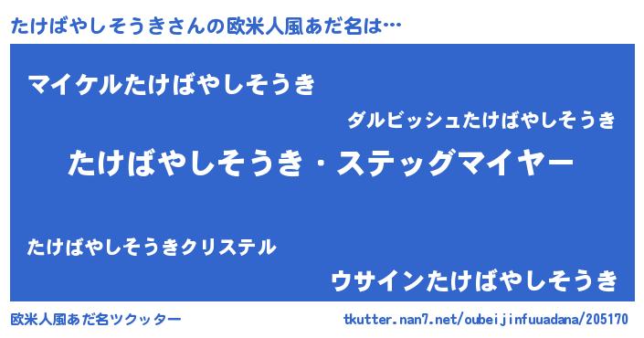 | 男性向けラノベタイトル風あだ名 | 『緋弾のタケバヤシソウキ』 |