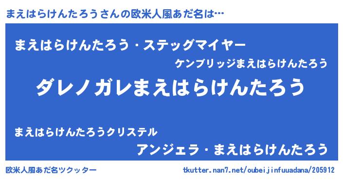 | 男性向けラノベタイトル風あだ名 | 『魔弾の王とまえはらけんたろう』 |
