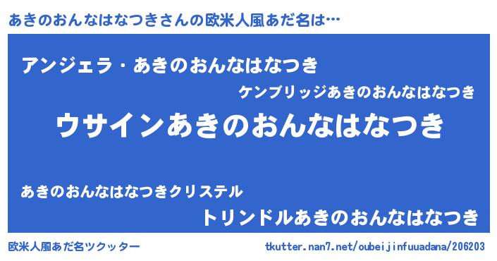 | 男性向けラノベタイトル風あだ名 | 『あきのおんなはなつきの嫁は女の子じゃないと思った?』 |