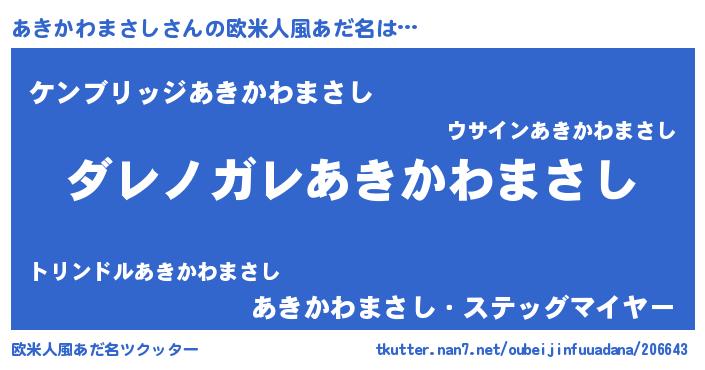 | 男性向けラノベタイトル風あだ名 | 『魔弾の王とあきかわまさし』 |