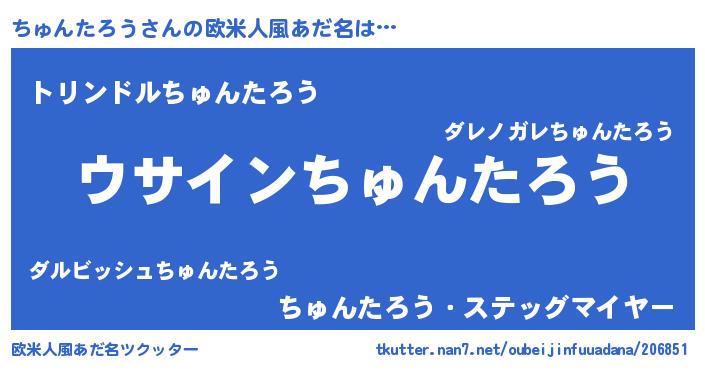 男性向けラノベタイトル風あだ名 | 『ちゅんたろうの嫁は女の子じゃないと思った?』 |