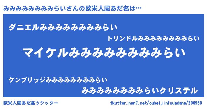 女子向けラノベタイトル風あだ名 | 『(仮)みみみみみみみみらいのやんごとなき事情』 |