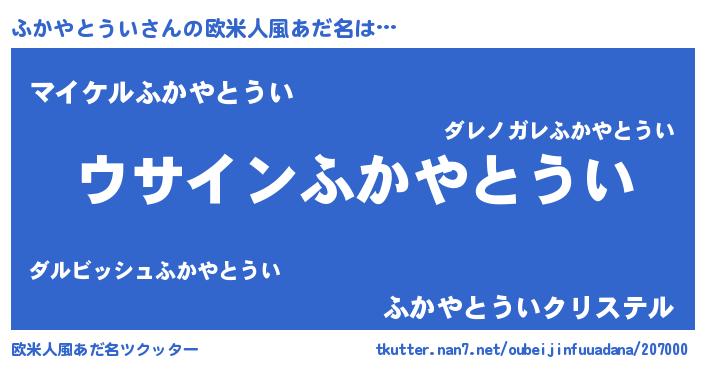 | 男性向けラノベタイトル風あだ名 | 『ダンジョンにふかやとういを求めるのは間違っているだろうか』 |