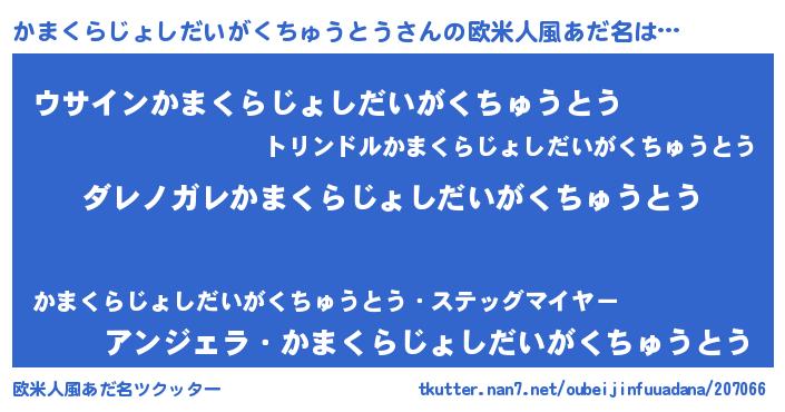 女子向けラノベタイトル風あだ名 | 『かまくらじょしだいがくちゅうとうが死なない童話 林檎のかまくらじょしだいがくちゅうとうの診療簿』 |