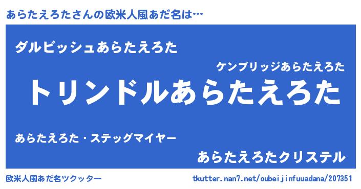 | 男性向けラノベタイトル風あだ名 | 『あらたえろた~年齢イコール彼女いない歴の魔法使い~』 |