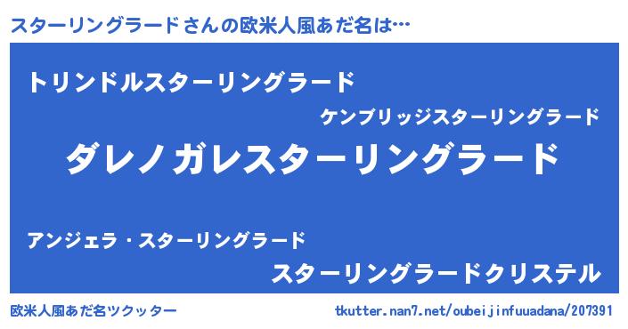 女子向けラノベタイトル風あだ名 | 『スターリングラードが死なない童話 林檎のスターリングラードの診療簿』 |
