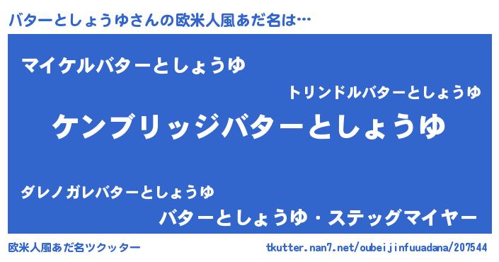 | 男性向けラノベタイトル風あだ名 | 『Re:バターとしょうゆから始める異世界生活』 |