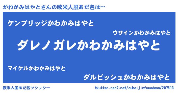| 男性向けラノベタイトル風あだ名 | 『この素晴らしい世界にかわかみはやとを!』 |