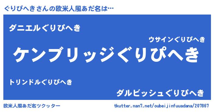 | 男性向けラノベタイトル風あだ名 | 『Re:ぐりぴへきから始める異世界生活』 |